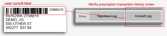 This barcode number starts with the letter “C” followed by the transaction number. To view in WinRx, edit the prescription and hit F3 to view transactions. Select the transaction and click the "consult log” button. The consult label/barcode is optional and not needed if using the signature label for consult check.