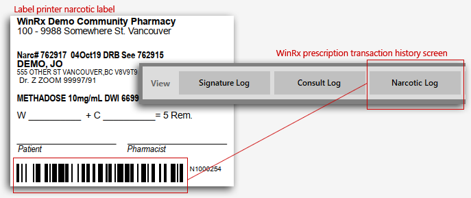 This label/barcode will print when you fill a narcotic prescription. To view in WinRx, edit the prescription and hit F3 to view transactions. Select the transaction and click the “narcotic log” button.