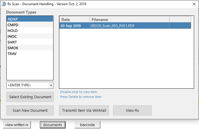 In the patient profile and the edit prescription screens you can click the "barcode" button and enter a 4 character document type (letters only, no numbers) to print a user defined barcode. Processed pages from these barcodes can be viewed by clicking the "documents" button and will appear under the document type that was entered. The